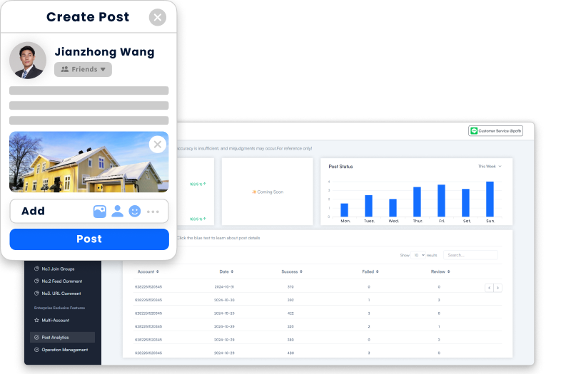 Random breaks, auto-sharing, deletions, and unique images and texts minimize repeat post detection.